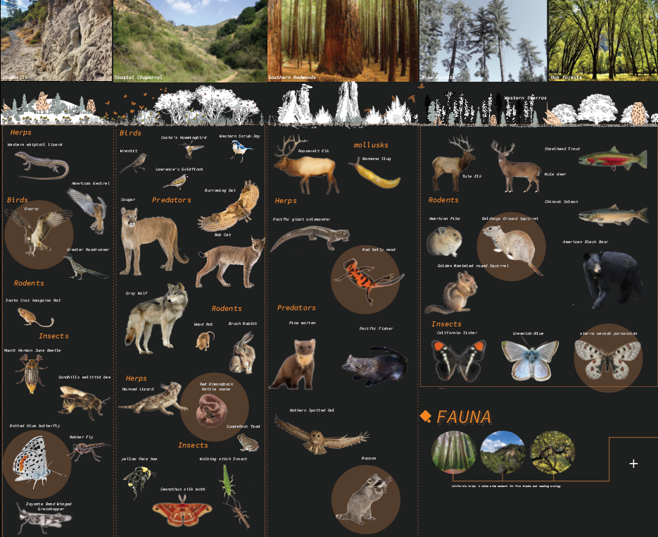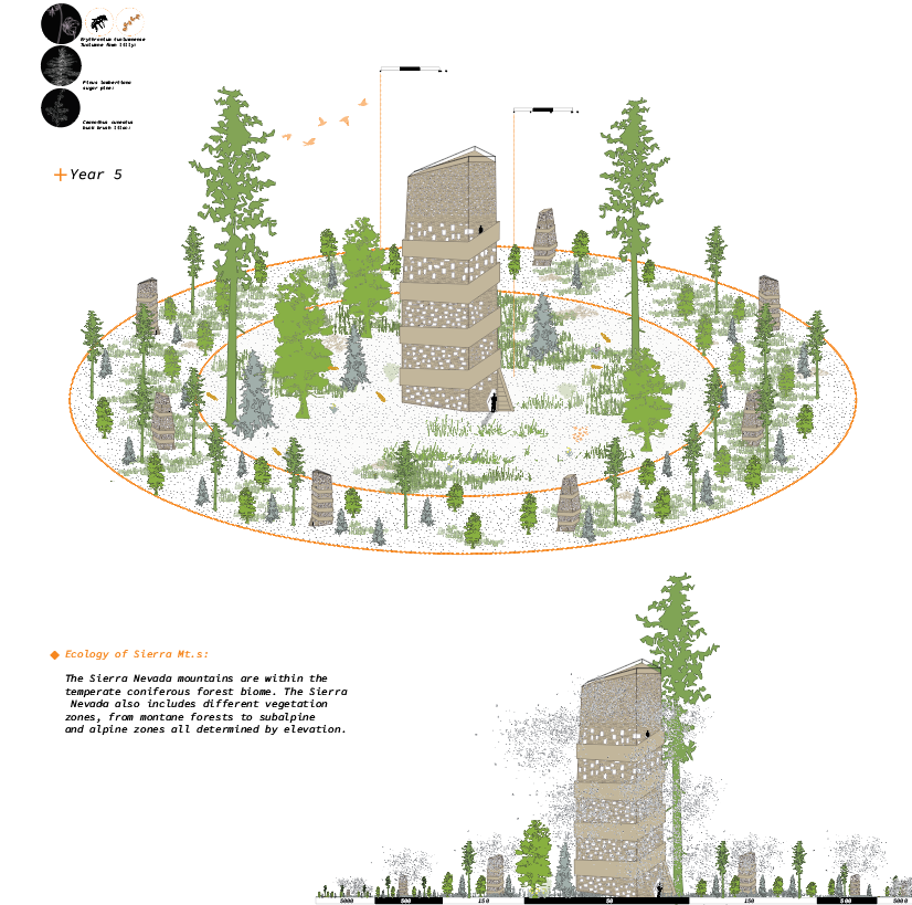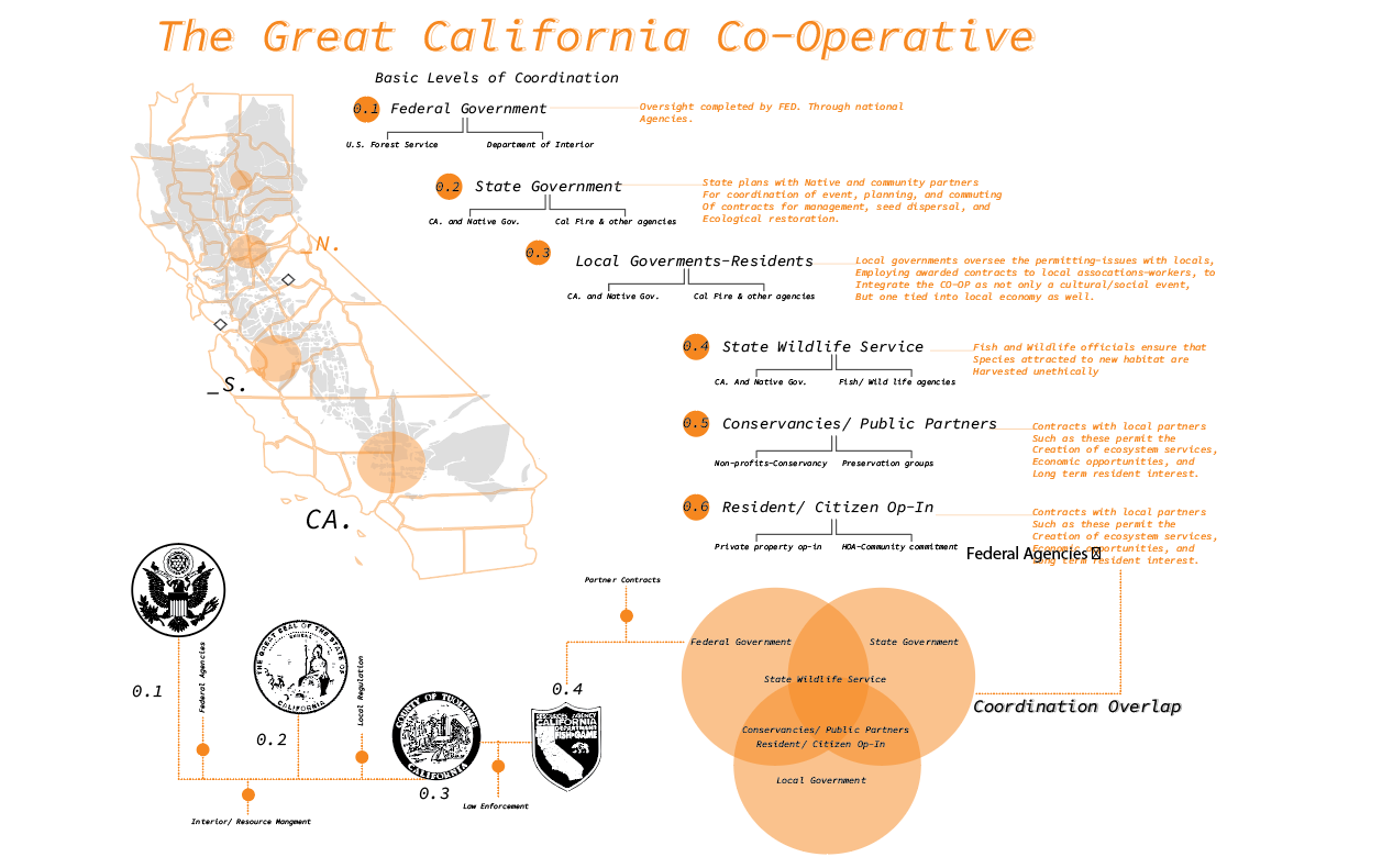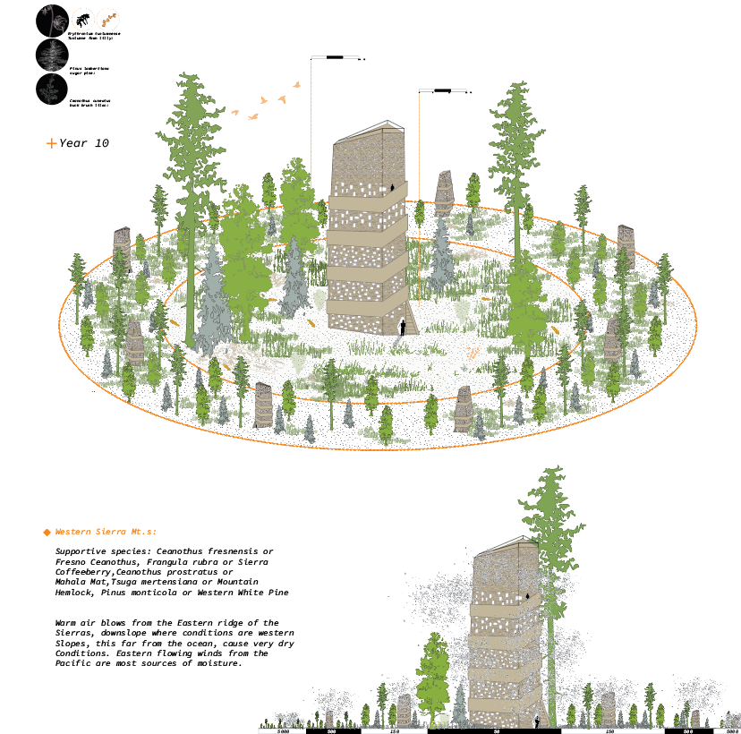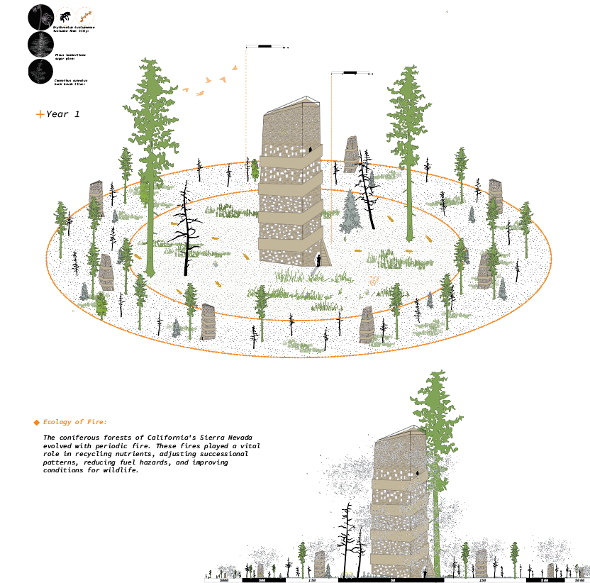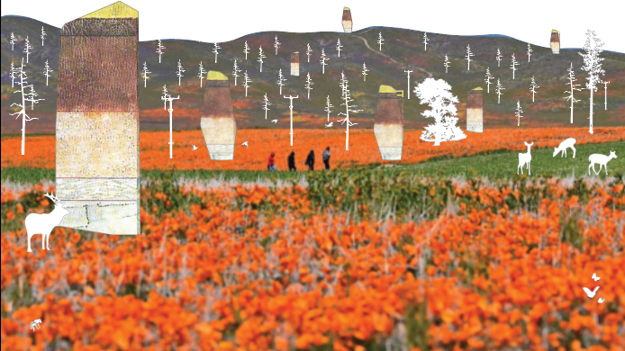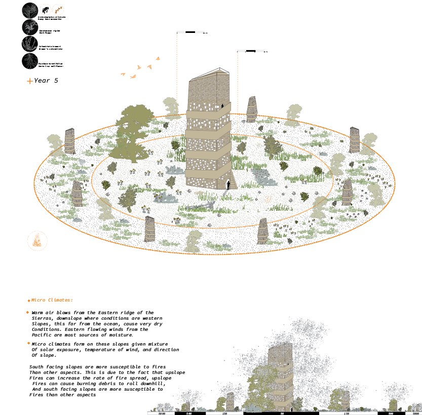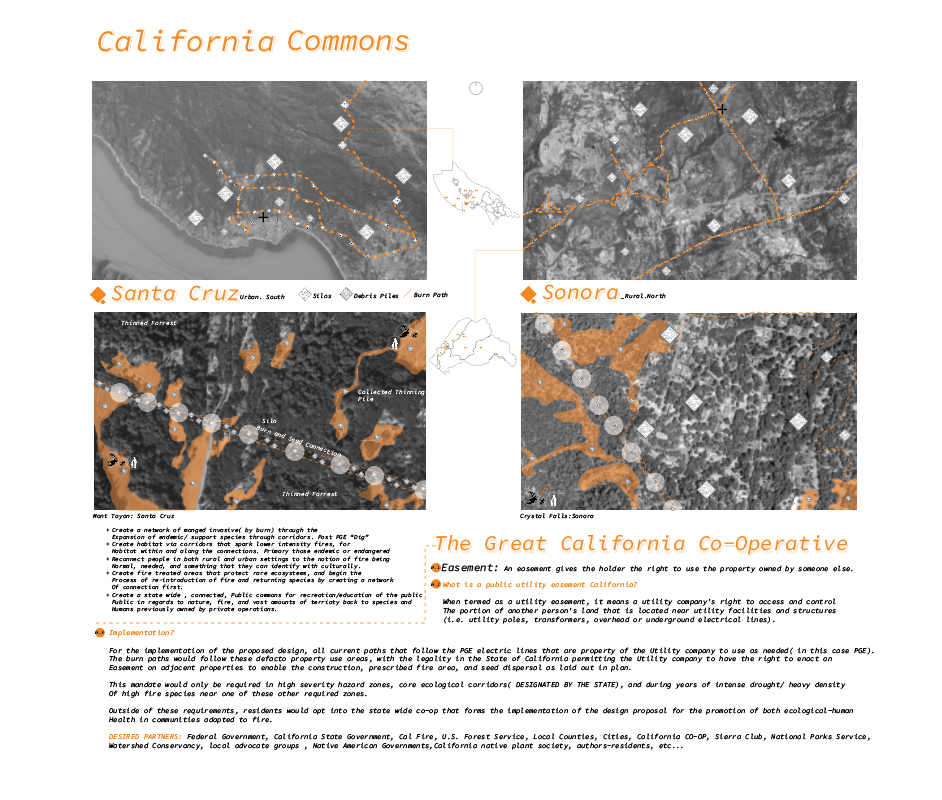 The proposal is to create a system of seed storage and distribution mechanisms deemed “Silos”, to be located across the newly created CA. Commons network. These “Silos” embed knowledge, memory, ecology, and cultural significance; seeking to perform as a nursery of fire for both species cultivation and human knowledge. The location of silos was placed on key ridges, following previous fire lines, to mark the history of fire as the lands in which they are located change(specifically Santa Cruz and Sonora).