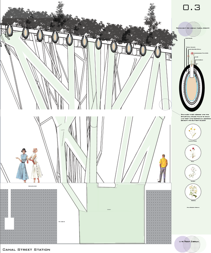 Canal Street Station II was a redesign prompt for the Canal Street station and was focused on a thinning of heavy tectonic elements and an urban connection to nature and planning for water recycling for its live roof.