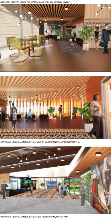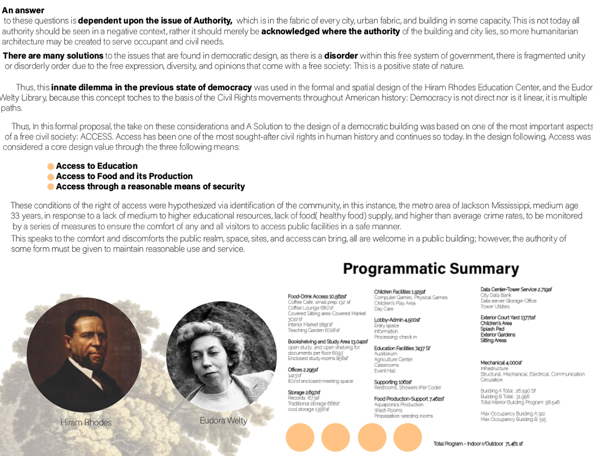 Hiram Rhodes Center-Eudora Welty Library What does a library mean to members of the public in modern times? In what ways is a democracy or democratic values held or authorized in public buildings? What is the authority of the designer, city, community, or State in the architecture of civic life? How can the role be redefined for the needs of twenty-first-century American society, in a manner that acknowledged the past so a path forward may be created?