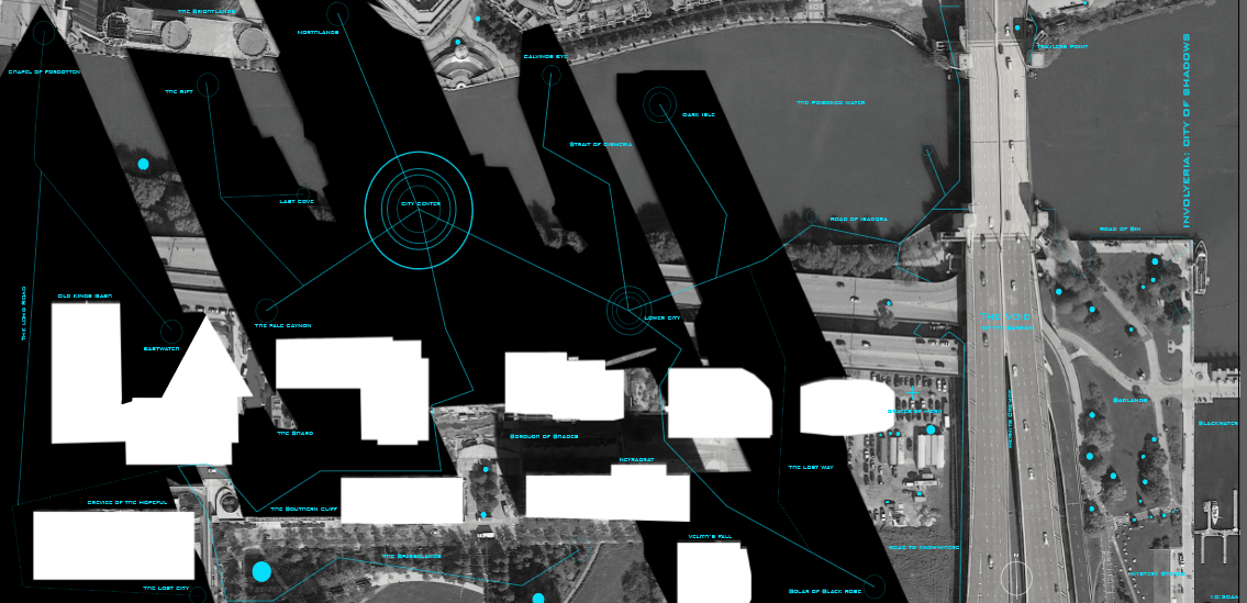 A project for a representations course, thinking of two cities in one. The city of Chicago, which exists at all times of the day and night, is still and upfront, and the city of Involyeria exists in shadow and only in shadow. Here, the city changes by the hour, being non-existent at noon and at its full power at night. Gauging this flow from a series of perspectives, are both cities known?