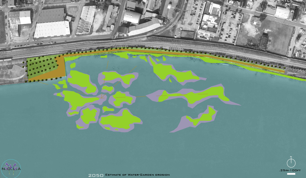 Creation of Water Gardens in the Mississippi River across from the Algiers Point neighborhood In New Orleans. Meant to be marked in its form via wooden pylons, such as those of a pier, it is meant to degrade over time and encapsulate a living history for the city, and serve as a center of connection between the river, time, effects of time, and the unfathomable city of New Orleans.