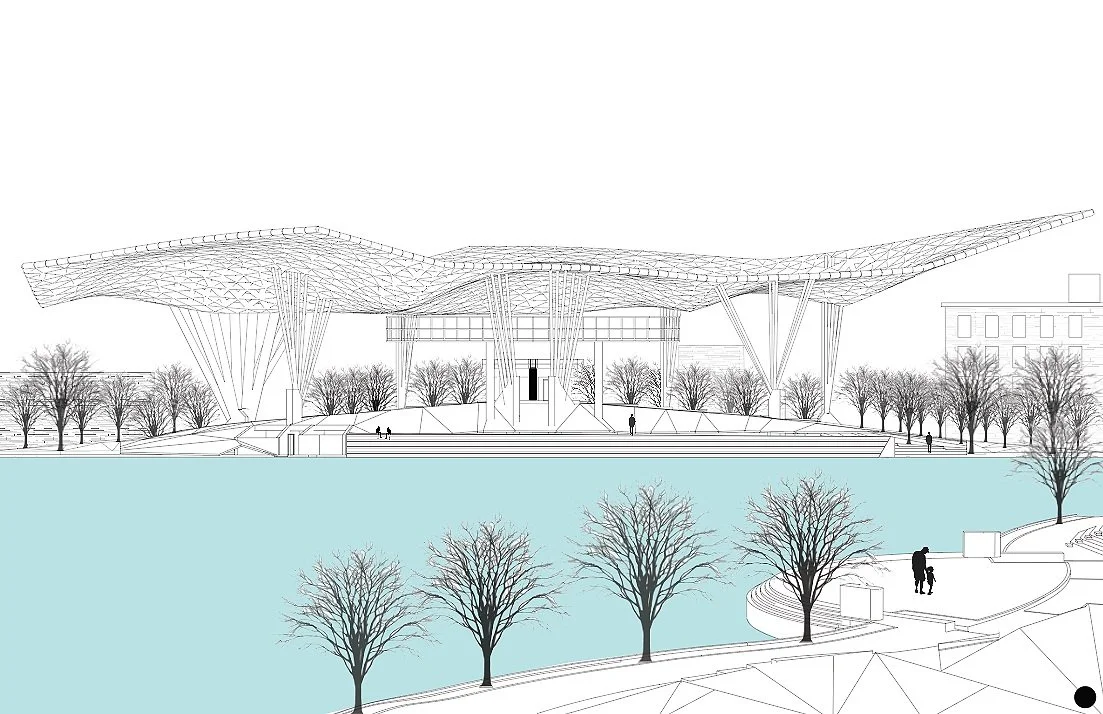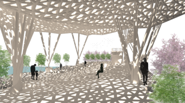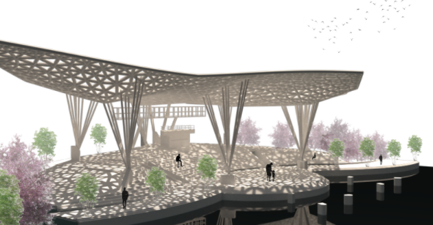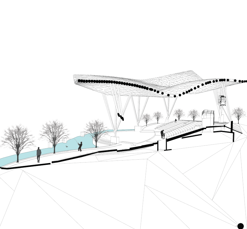 The key purpose was an exercise to use multiple software for the creation of a logical structure and something unique aesthetically. The structural pattern that comprises the the pavilion was based on the refraction of light through the reflecting pools next to the theater seating and that weave through the park itself.